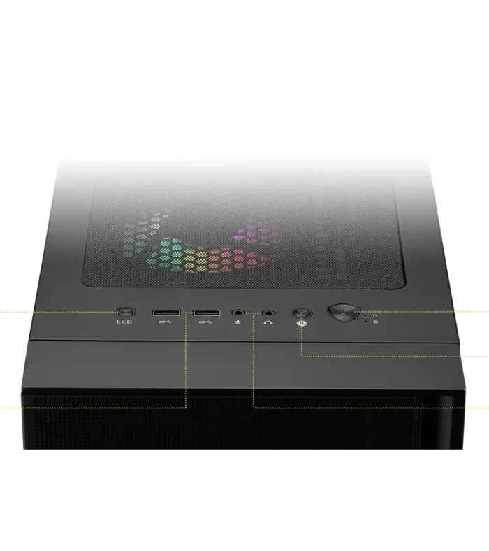 دسترسی سریع و آسان به پورت‌ها، یکی از نکات مهم در انتخاب کیس گیمینگ است. MSI MAG FORGE 120A AIRFLOW با تعبیه 2 عدد پورت USB 3.2 Gen 1 Type-A در پنل بالایی، سرعت بالای انتقال داده‌ها را برای شما به ارمغان می‌آورد. همچنین، پورت خروجی هدفون و پورت ورودی میکروفون نیز برای اتصال آسان هدست گیمینگ شما فراهم شده‌اند، که این امکان را به شما می‌دهد تا بدون نیاز به دسترسی به پشت سیستم، به راحتی به ارتباط صوتی در بازی‌ها بپردازید. این چیدمان هوشمندانه پورت‌ها، تجربه کاربری راحت و بی‌دغدغه‌ای را برای گیمرها تضمین می‌کند.