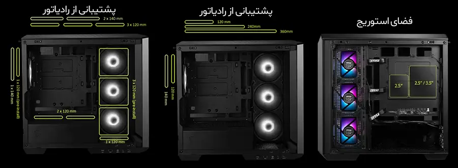 تعداد فن قابل نصب در مجاور قابلیت نصب 3 عدد فن 120 میلیمتری |