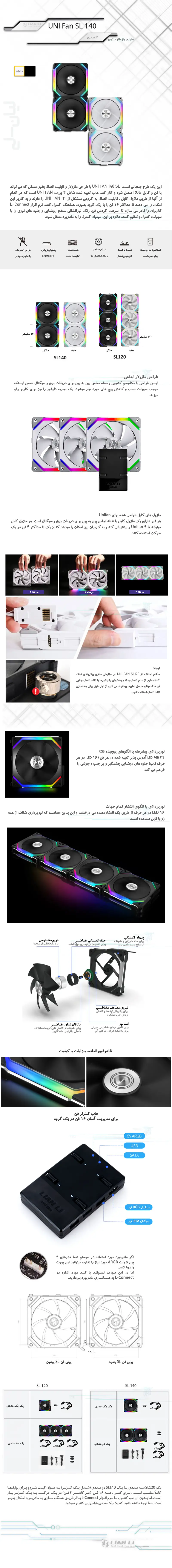 این یک طرح جنجالی است. SL 140 UNI FAN با طراحی ماژولار و قابلیت اتصال بطور مستقل که می تواند با فن و کابل RGB متصل شود و کار کند. هاب تعبیه شده شامل 4 پورت UNI FAN است که هر کدام از آنها از طریق ماژول کابل ، قابلیت اتصال به گروهی متشکل از 4 UNI FAN را دارند و به کاربر این امکان را می دهند تا حداکثر 16 فن را با یک گروه بصورت هماهنگ کنترل کنند. نرم افزار L-Connect کاربران را قادر می سازد تا سرعت گردش فن، رنگ نورافشانی ،سطح روشنایی و جلوه های نوری را با سهولت کنترل و تنظیم کنند. علاوه بر این، میتوان کنترل را به مادربرد منتقل نمود.