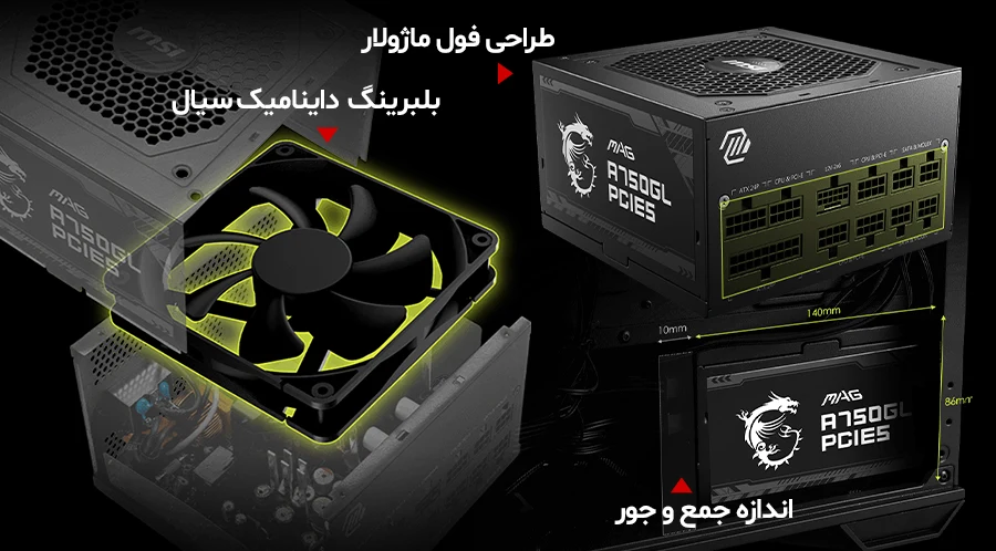 پاور 750 وات MSI MAG A750GL PCIE5 Full Modular با ترکیب توان خروجی بالا، راندمان عالی، طراحی ماژولار، کابل‌های تخت، فن بی‌صدا و مکانیسم‌های حفاظتی کامل، یک انتخاب ایده‌آل برای سیستم‌های گیمینگ و حرفه‌ای محسوب می‌شود. این پاور قدرتمند، تمام نیازهای سیستم شما را به بهترین شکل برآورده ساخته و پایداری و عملکرد بی‌نقص آن را تضمین می‌نماید.